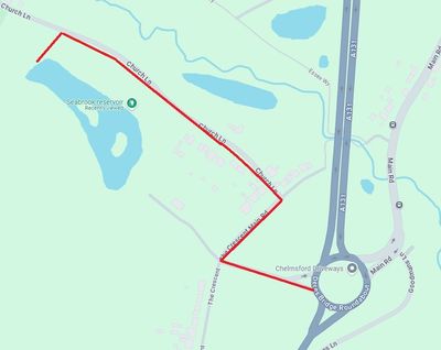 From Chelmsford, take the A131 Braintree Road to the roundabout and pickup the Seabrooks Farm signed exit as above. Continue along Church Lane and turn left just before the church onto a dirt track